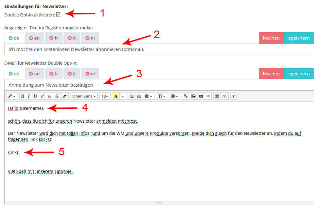 Anschliessend können Sie die zu verschickende E-Mail bearbeiten. Sie können hierfür eine eigene Betreffzeile einfügen (3), den User mit seinem Benutzernamen ansprechen (4), einen freien Text verfassen und einen Bestätigungslink für den Double-Opt-In-Prozess erzeugen (5). Unser Bestätigungslink erstellt sich automatisch für jeden User selbst über die Variable „{link}“.