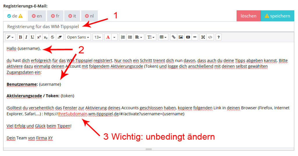 Hinterlegen Sie einen eigenen Text für die Registrierungsnachricht. Denken Sie hierbei auch an eine Signatur und die Betreffzeile (1). Die Variablen „username“ und „token“ sind für Ihre E-Mails Pflicht und setzen jeweils individuelle Inhalte an diese Stelle (z.B. wird aus „Hallo {username}“ später ein „Hallo Peter“ (2).)