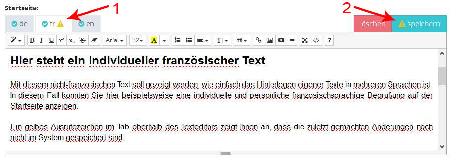 Ein gelbes Ausrufezeichen im Tab oberhalb des Texteditors zeigt Ihnen, dass die zuletzt gemachten Änderungen noch nicht im System gespeichert sind und Sie dies noch nachholen sollten. Ein grüner Kreis mit Haken bedeutet, dass die Anpassungen gespeichert wurden. Beachten Sie bitte auch das Hinterlegen der Texte in weiteren Sprachen (en, fr, it, nl), falls Sie diese gebucht haben.