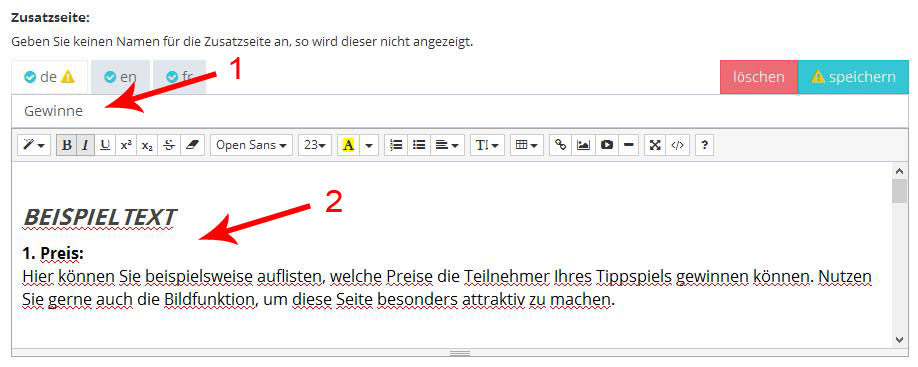 Definieren Sie zuerst Ihren Reiternamen (1) und gestalten dann den Inhalt der zusätzlichen Seite (2). Denken Sie auch an alle Übersetzungen, sollten Sie die Integrierbarkeit weiterer Sprachen bei uns gebucht haben (Reiter & Inhalt im Texteditor).