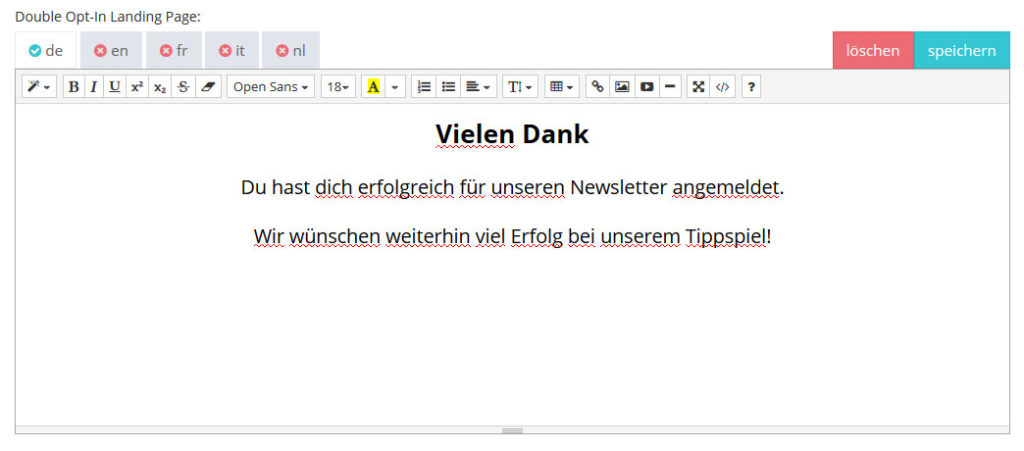 Dass der Teilnehmer sich erfolgreich für den Newsletter eingetragen hat, können Sie ihm ebenfalls anzeigen. Nutzen Sie hierfür das Textfeld „Double Opt-In Landing Page“.
