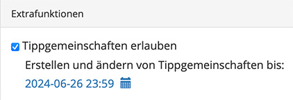 Falls Sie im Tippspiel auch Tippgemeinschaften nutzen wollen, können Sie einen Zeitpunkt definieren, bis zu dem das Erstellen von Tippgemeinschaften und auch das Beitreten und Anpassen von Tippgemeinschaften möglich ist. Standardmässig ist dies mit dem Ende der Gruppenphase eingestellt (26.06.2024 um 23:59 Uhr).