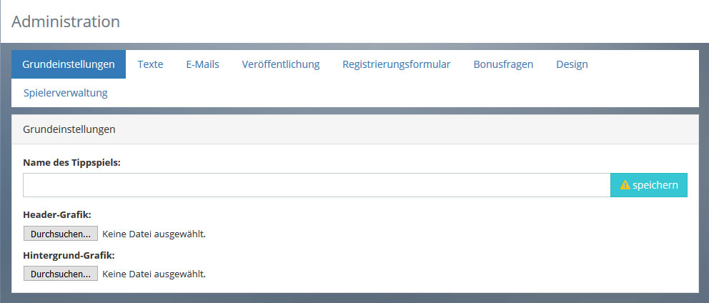 Vergeben Sie Im Reiter „Grundeinstellungen“ einen Namen für Ihr Tippspiel und laden dann Ihre vorbereitete Headergrafik hoch. Beachten Sie bitte die hierfür geltenden Empfehlungen zum Bildformat.