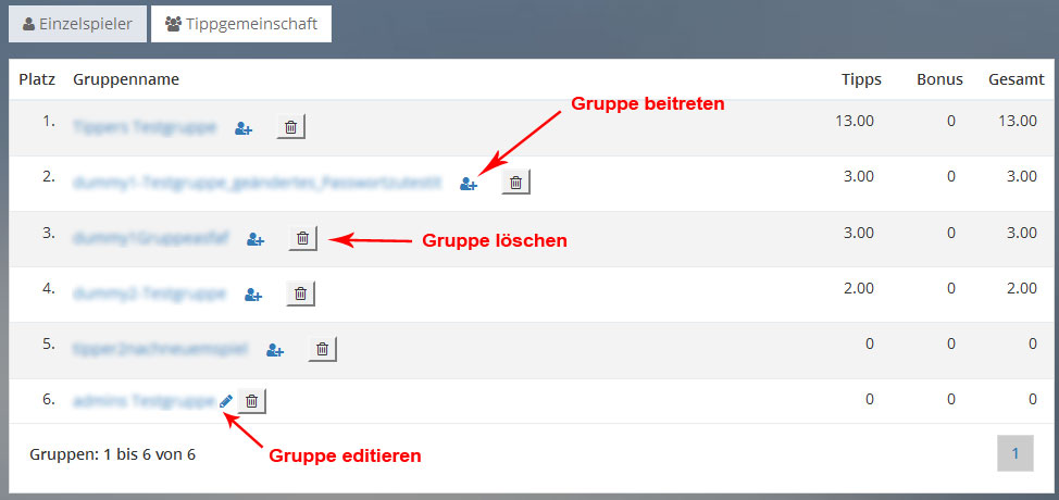 Wie Sie bestehende Tippgemeinschaften verwalten können, sehen Sie im folgenden Screenshot.