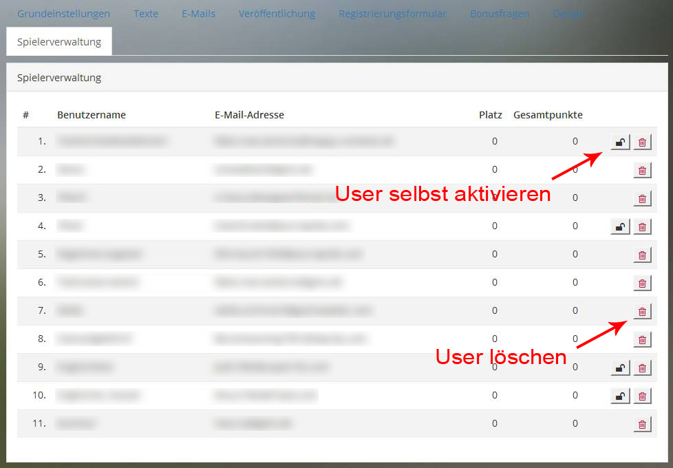 Im Administrationsbereich finden Sie mittlerweile auch Ihre Spielerverwaltung. Diese dient der Löschung oder Aktivierung einzelner Teilnehmer.
