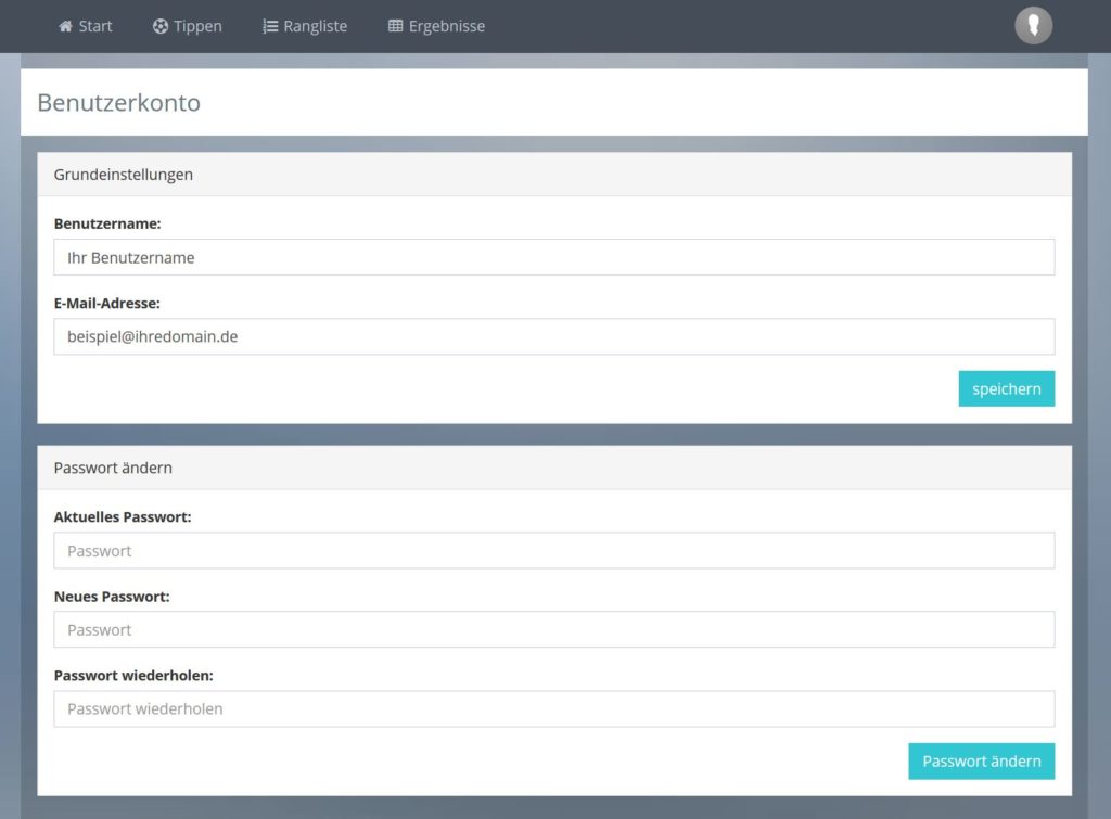 Bitte ändern Sie gleich zu Beginn Ihr vorläufiges Passwort, welches wir Ihnen mit den restlichen Informationen zum Tippspiel zugeschickt haben. Um das Passwort ändern zu können, loggen Sie sich bitte zuerst ein und klicken dann rechts oben auf das User-Icon. Wenn Sie auf Ihren Benutzernamen klicken, gelangen Sie zu Ihrem Profilbereich und können dort das vorläufige Passwort ändern.