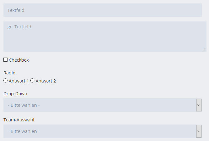 Auch welche Art von Formularfeldern Sie bei der Registrierung verwenden möchten, können Sie selbst einstellen. Wie die jeweiligen Formularfelder in der Endansicht dargestellt werden, sehen Sie anbei.
