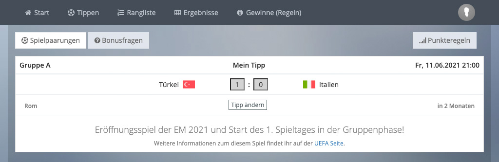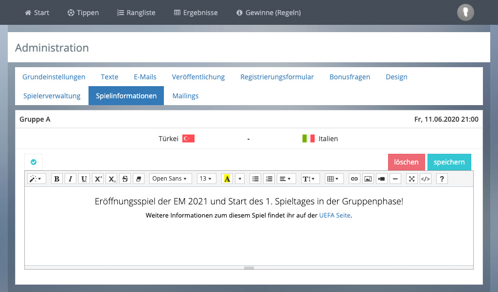 Sobald Sie Ihre Account-Daten mitgeteilt bekommen haben, können Sie sich jederzeit über Ihre Tippspieldomain als Administrator einloggen und Ihr Tippspiel bearbeiten. Eine Bearbeitung ist auch während der laufenden EM noch möglich.