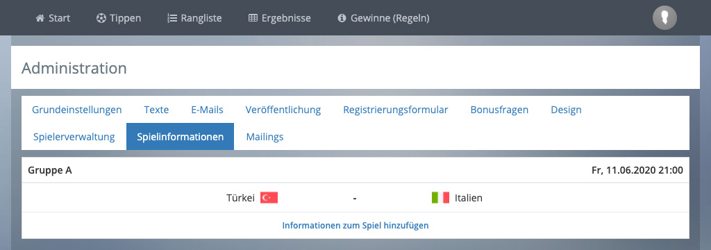Wenn Sie die die Funktion „Informationen zum Spiel hinzufügen“ nutzen wollen, können Sie im Administrationsbereich unter Spielinformationen für jedes Spiel zusätzliche Informationen angeben.