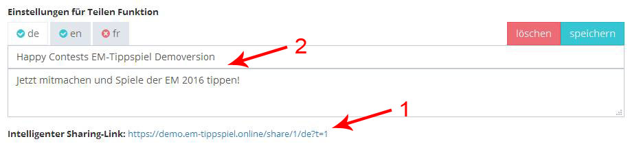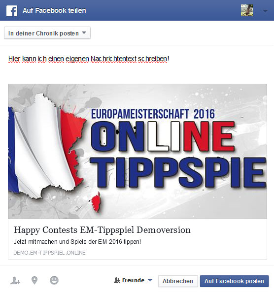 Wenn Sie möchten, können Sie noch für die im Tippspiel integrierten Sharing-Funktionen individualisierte Sharing-Texte für den Titel und eine Kurzbeschreibung verwenden (2). Diese werden dann beim Teilen des Tippspiels in sozialen Netzwerken übernommen. Das Bild sucht sich Facebook automatisch und kann nicht geändert werden.
