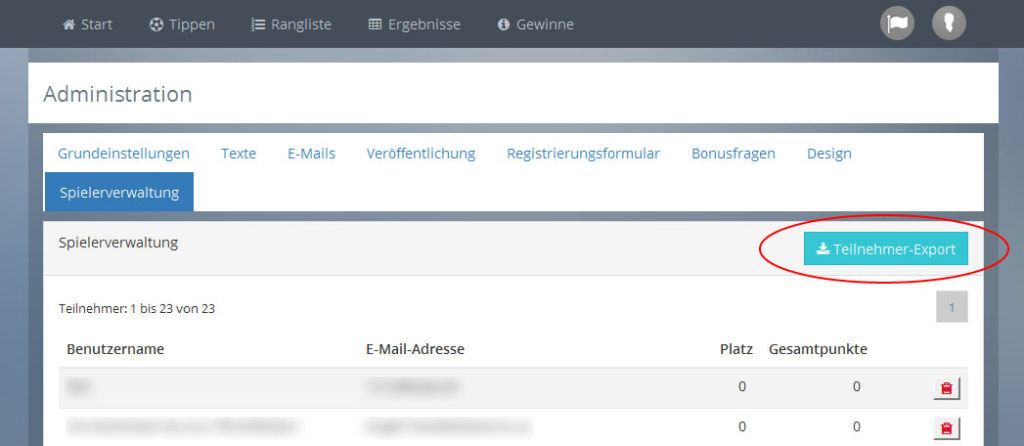 Die Spielerverwaltung und der Teilnehmer-Export sind zwei unterschiedliche Funktionen. Mit der Spielerverwaltung können Sie aktivieren und löschen, mit dem Teilnehmer-Export können Sie alle von den Teilnehmern bei der Registrierung eingegebenen Daten herunterladen.