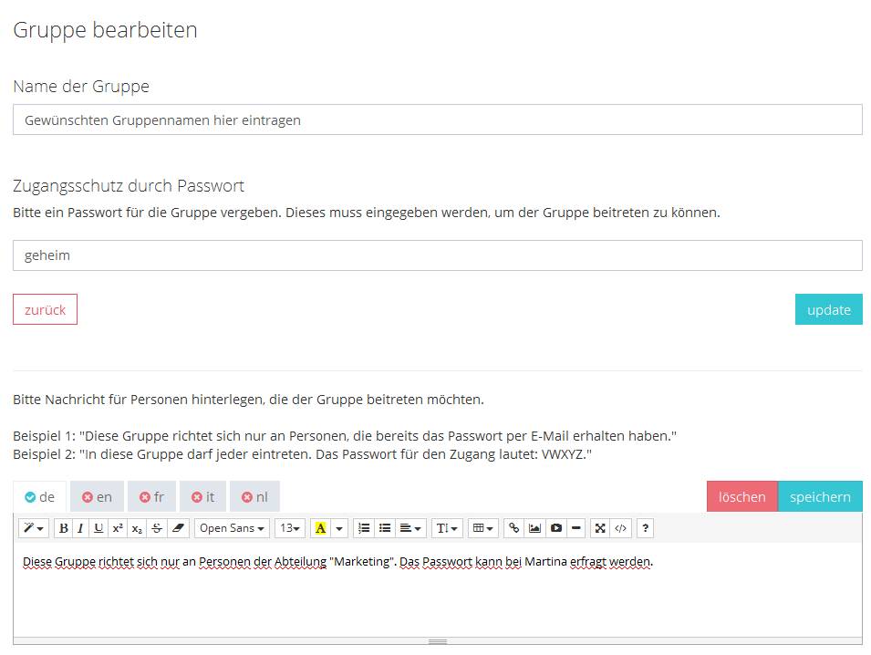 Beispiel 1: „Diese Gruppe richtet sich nur an Personen, die bereits das Passwort per E-Mail erhalten haben.“