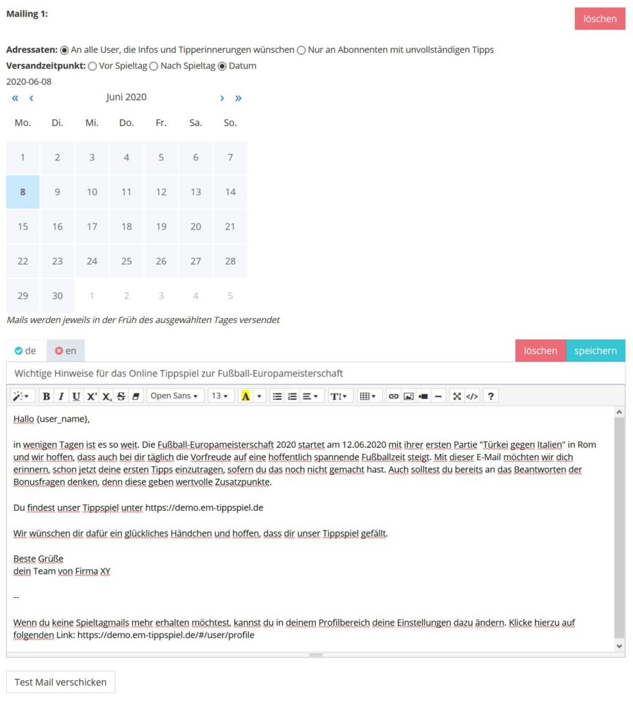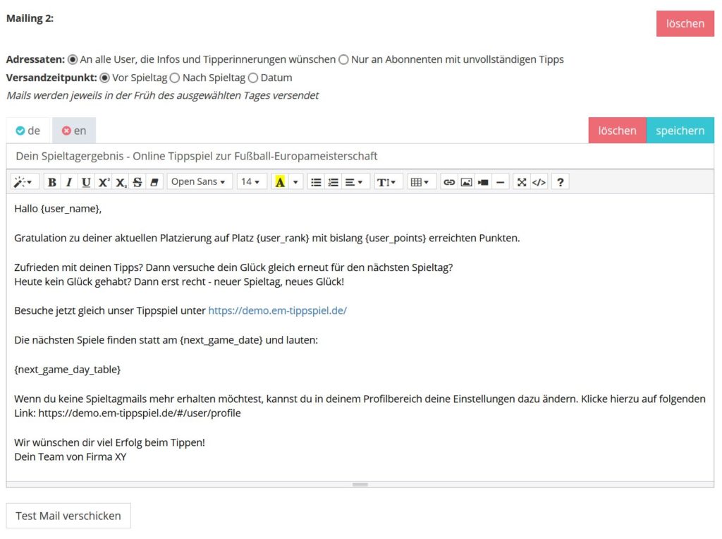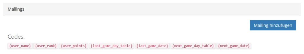 Wenn Sie möchten, können Sie für Ihr Tippspiel automatisch versendete Reminder-E-Mails nutzen, die Ihre Teilnehmer zum Tippen motivieren und sie zusätzlich über ihre aktuelle Platzierung und die erreichte Punktezahl informieren. Die Einstellungen hierführ können Sie im Reiter „Mailings“ vornehmen. Dabei können Sie selbst entscheiden, wann die Mailings verschickt werden, ob diese personalisiert sein sollen oder nicht und ob Sie zusätzliche individuelle Infos zu vergangenen Spieltagen mitsenden wollen. Folgende Codes können Sie für Ihre Nachrichten zur Individualisierung verwenden: